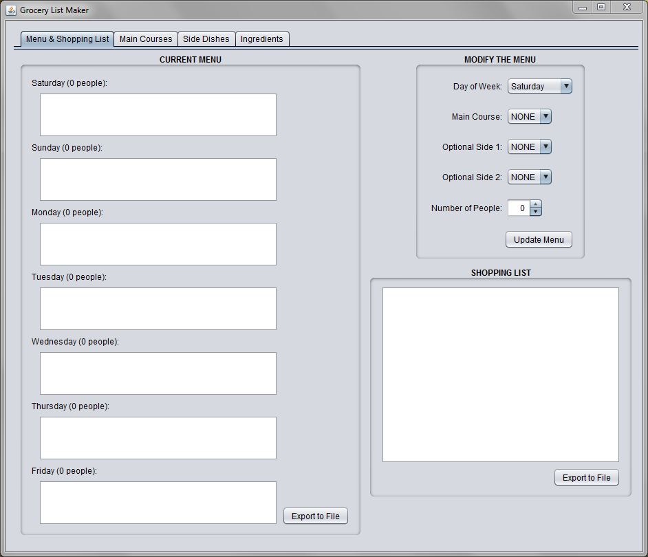 A desktop application for generating a weekly menu and a grocery list. It allows the user to completely create their own collections of ingredients, side dishes, and main courses. It is still "in beta". Files grocery-list-maker-0.2.zip |